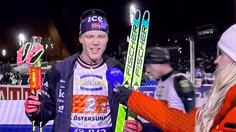 IMPONERTE I VINDEN. – Det var deilig, og godt å få fullt på stående. Vinden var vanskelig og kom uventa på, så det var dritvanskelig, uttalte Martin Uldal til NRK etter sin knockout på første etappe i Østersund lørdag. (Foto: Skjermdump NRK)