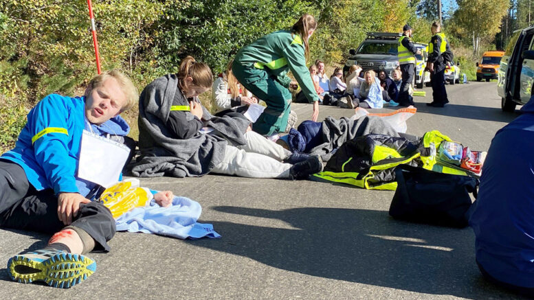BUSS I ELVA. Ved Rugsland ble det simulert at en buss havnet i elva. Disse ble så reddet inn, også av dykkere. Mange av aktørene ble så fraktet til Akuttmottaket i Kristiansand for videre behandling.