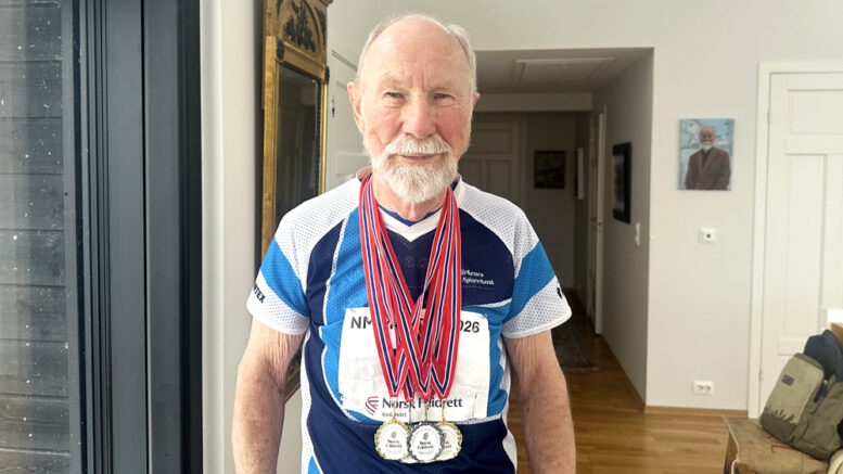 MEDALJEGROSSIST. Bjarne Bjorvatn ble rene medaljegrossisten i sitt første Norgesmesterskap. Tre gull og to sølv var resultatet etter helgens Friidretts-NM i klassen 90-94 år.
